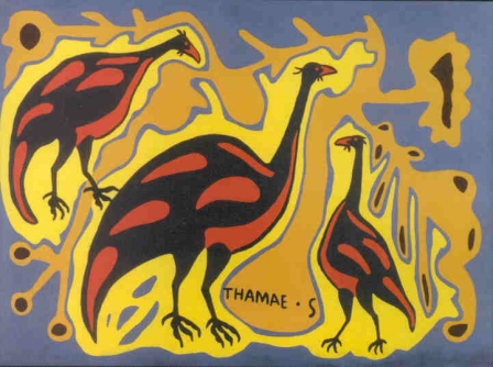 Die Bilder der San, der Buschleute des südlichen Afrikas, zeigen häufig die Tier- und Geisterwelt, wie die Perlhühner auf diesem Ölbild von Thamae Setshogo. Der Maler zählt heute zu den bekanntesten Künstlern Botswanas. Seit zwölf Jahren arbeitet er im 1990 gegründeten "Kuru Art Project". Nach diesem Modell entstand bald darauf in Südafrika die Initiative "!Xun & Kwe".